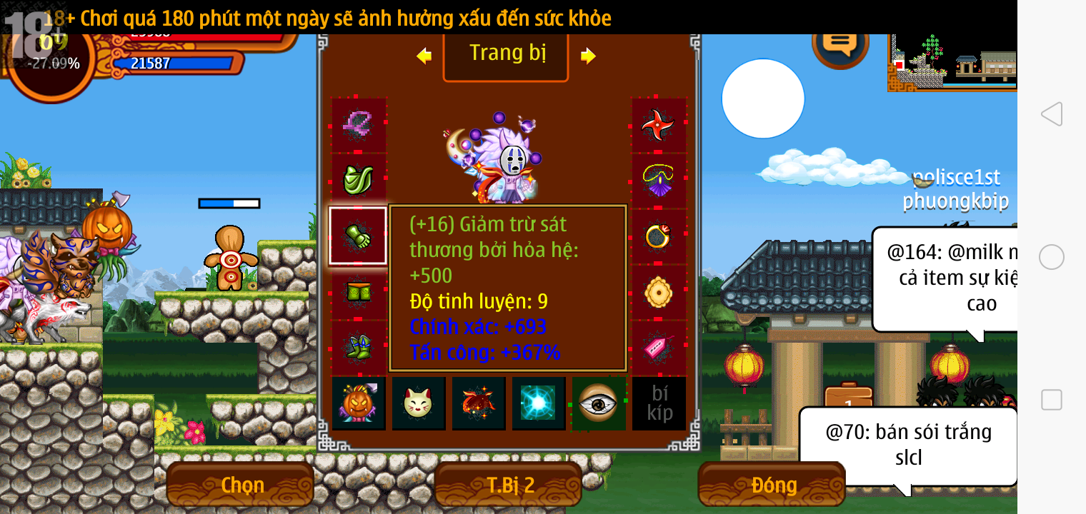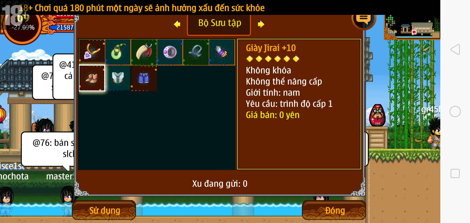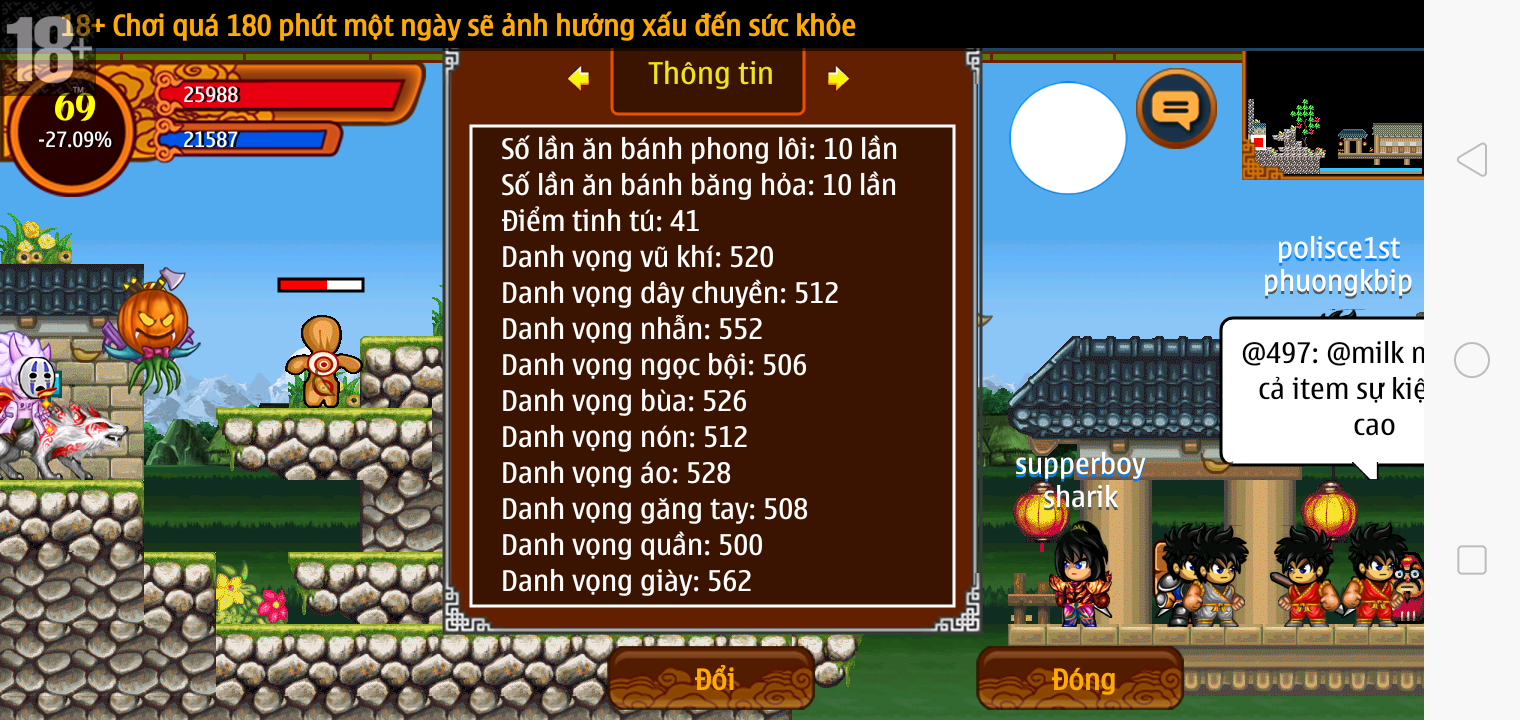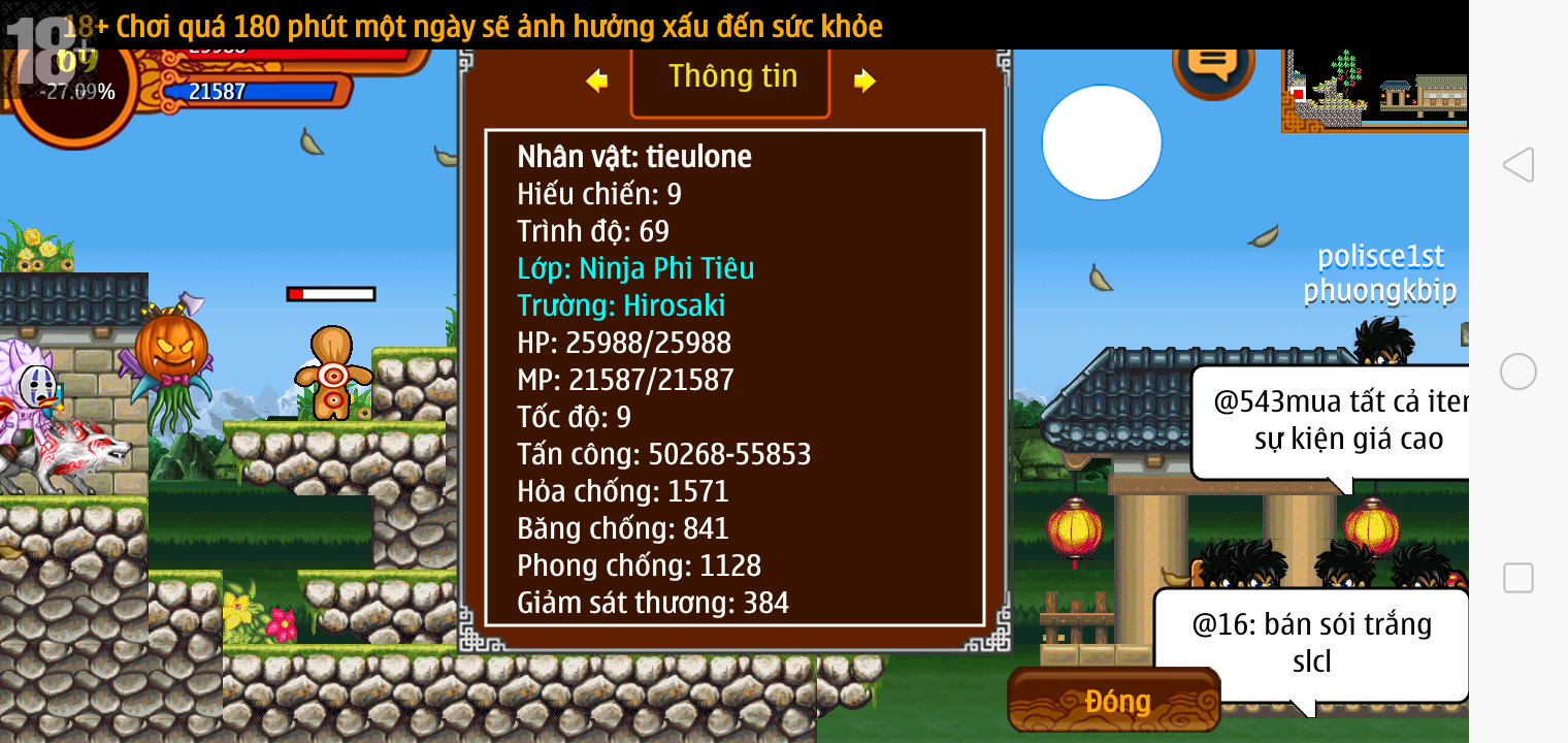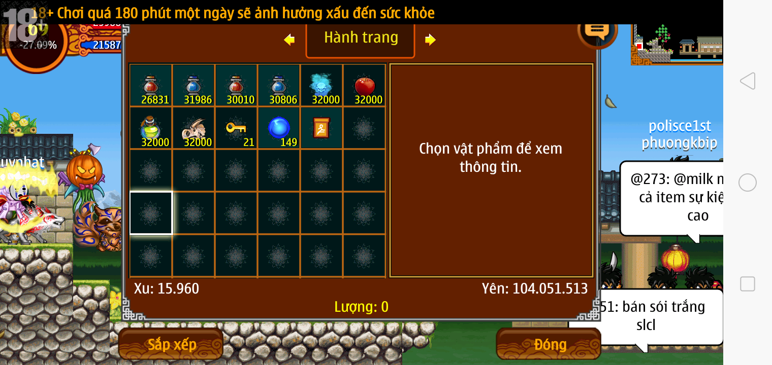 Thông tin: F16, ftl9, Sx 5* + Sói 5*2cm, tc, cx, ftbs9999, Vĩ thú v.v, 1nv, 104M Yên, CT vv: 2 cái, ~Jirai +4, Max sách, Max bánh,...VIP PRo